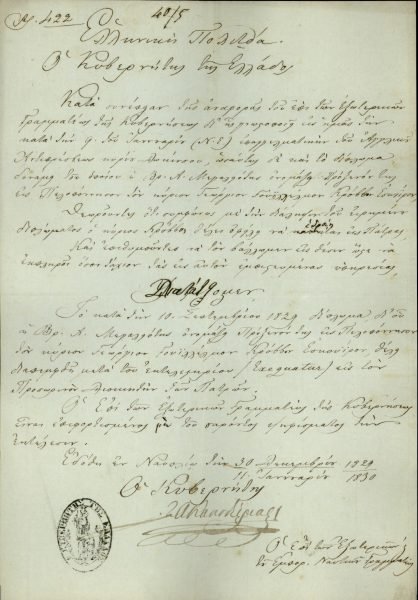 [10]22 Σεπτεμβρίου 1828. Επιστολή διαπίστευσης του Βρετανού Αντιπρεσβευτή E. Dawkins στην ελληνική Κυβέρνηση από τον Υπουργό Εξωτερικών του Ηνωμένου Βασιλείου George Hamilton-Gordon, Κόμη του Aberdeen.